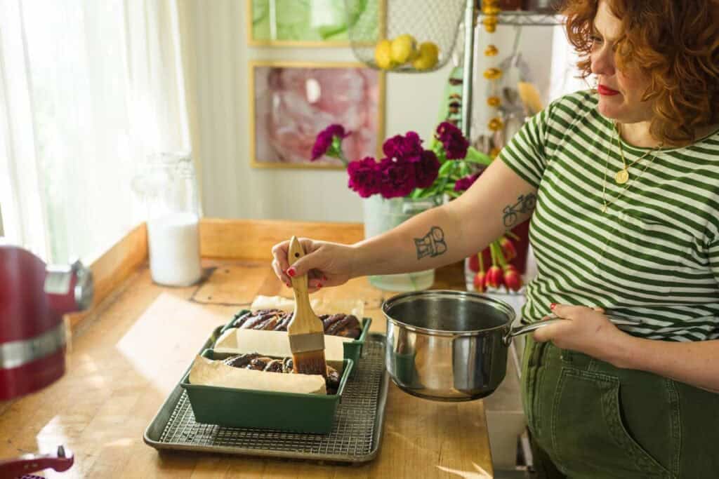- When babkas come out of the oven, brush generously with the warm syrup. Let sit for 15 minutes to absorb.